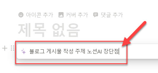 저는 메뉴에서 '블로그 게시물 작성 주제' 를 선택한 다음, '노션 AI 장단점' 이라고 입력 해 봤습니다.
