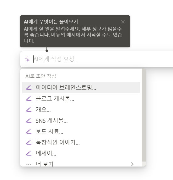 새 줄, 새 페이지에서 스페이스 키를 누르기만 하면 AI 기능이 활성화 됩니다.