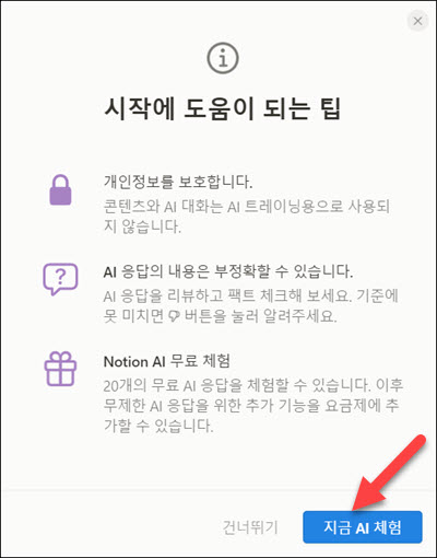 노션 AI 안내 팝업창이 나타나면, "지금 AI 체험" 버튼을 누릅니다.