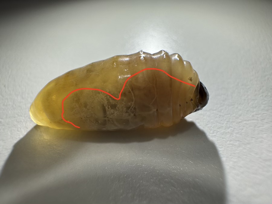 애벌레는 겉으로 보이는 배설 기관이 없습니다. 일벌이 애벌레의 머리를 자극하면 아미노산 액체를 뱉어내는데, 이때 노폐물도 같이 뱉어내는 것이 아닐까 짐작됩니다. 아미노산 액체를 받아주지 않으면 애벌레의 피부 안쪽에 노란색 액체가 점점 부풀어 오름을 볼 수 있습니다. 아마도 노폐물이 피부 안쪽에 축적되는 것으로 보입니다.