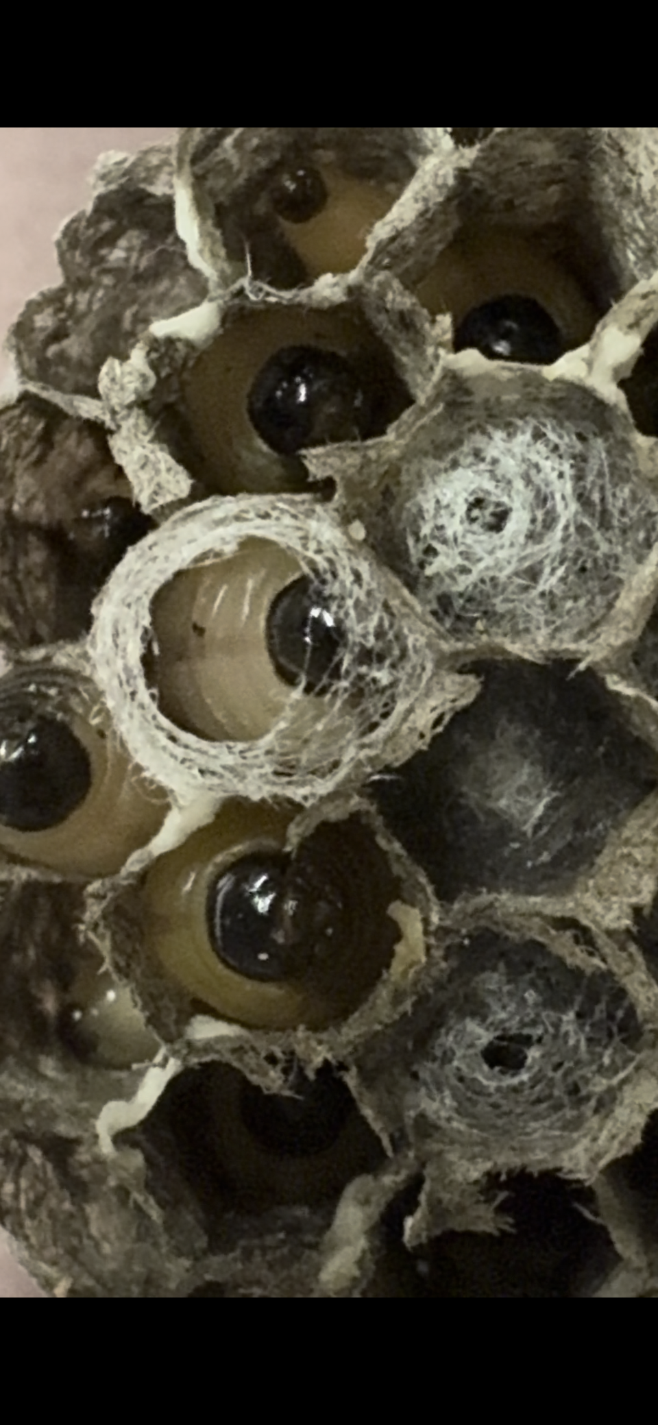 벌집은 육각형의 긴 터널 모양이며, 애벌레도 이 안에서 길게 늘어져 있습니다. 벌집에서 애벌레를 꺼내면 몸을 움츠려 통통해집니다. 벌집 밖에 꺼내 놓으면 성체로 우화 할 가능성이 매우 낮아지기 때문에 다시 넣어주는 게 좋겠죠. 그런데 한 번 꺼낸 애벌레는 통통해 있기 때문에 다시 벌집에 넣는 것은 어렵습니다. 억지로 넣으려 하지 말고, 애벌레를 구멍에 살짝 꽂아두고 벌집을 거꾸로 놓아두면 애벌레가 스스로 몸을 비틀어 구멍에 들어갑니다.