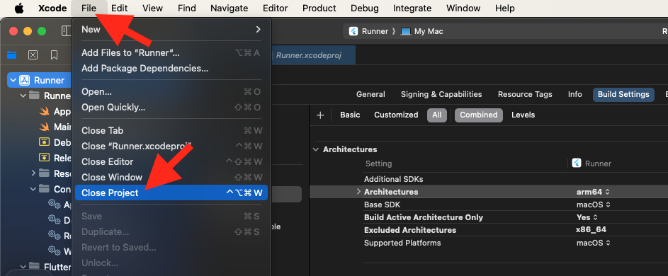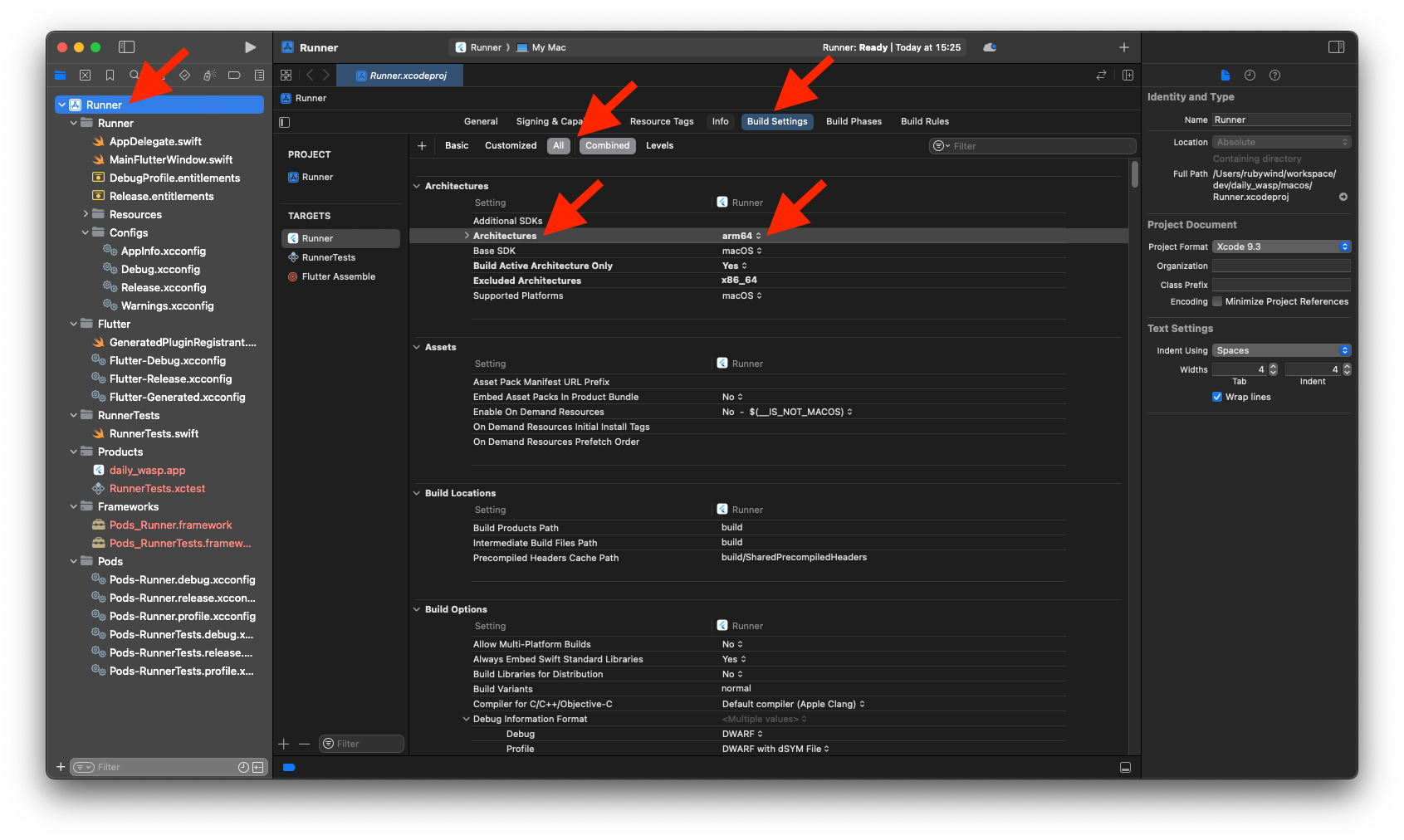 3.1 왼쪽 트리에서 Runner 클릭 > 오른쪽 화면에서 Build Settings 탭 선택 > All , Combined 클릭 > Architecture 항목에서 "Architectures" 선택