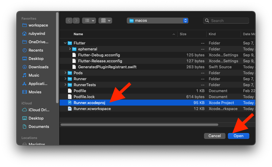 2. {your project folder}\macos\Runner.xcodeproj 선택 > Open 클릭