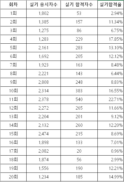 실기 합격률이, 대체로 10% 대에 머물러 있는 것을 보면.