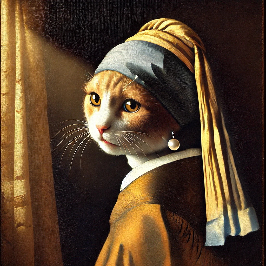 (2024년 11월 17일) Open AI의 ChatGPT에게, 똑같은 그림을 그려보게 했다. 프롬프트는 Johannes Vermeer 스타일대로 고양이 그림을 그려줘. "a cat with a pearl earring, by Johannes Vermeer" 였다.