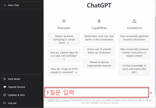 자.. 일단 가입은 다 했습니다. 지금 곧바로 ChatGPT 홈페이지에서 AI와 노닥거릴 수 있습니다. 추가로.. 아래 내용은, 크롬 브라우저에 ChatGPT Extension을 설치하는 방법입니다. (필요한 사람만 설치하세요.)
